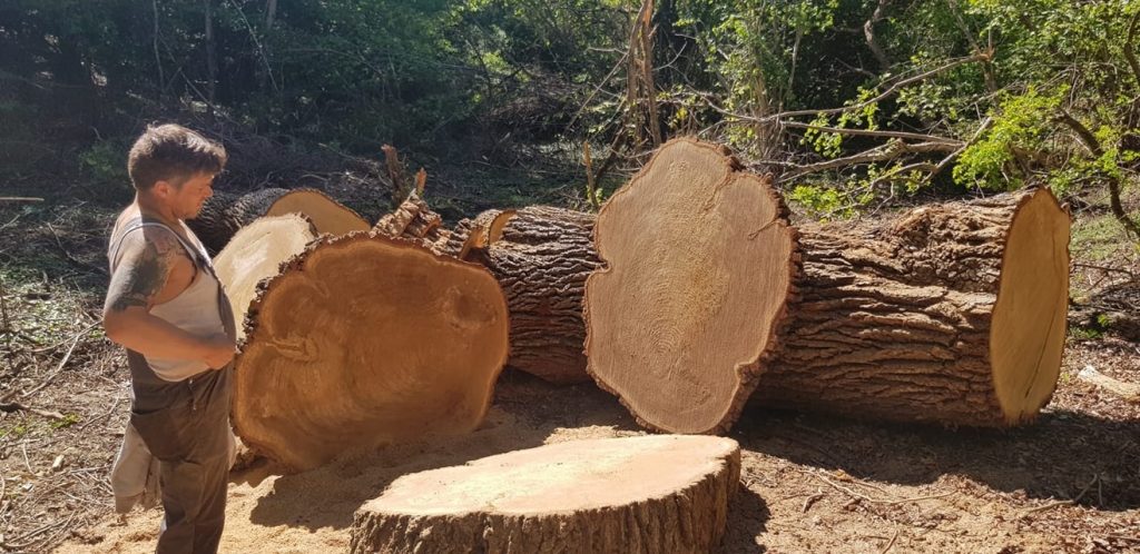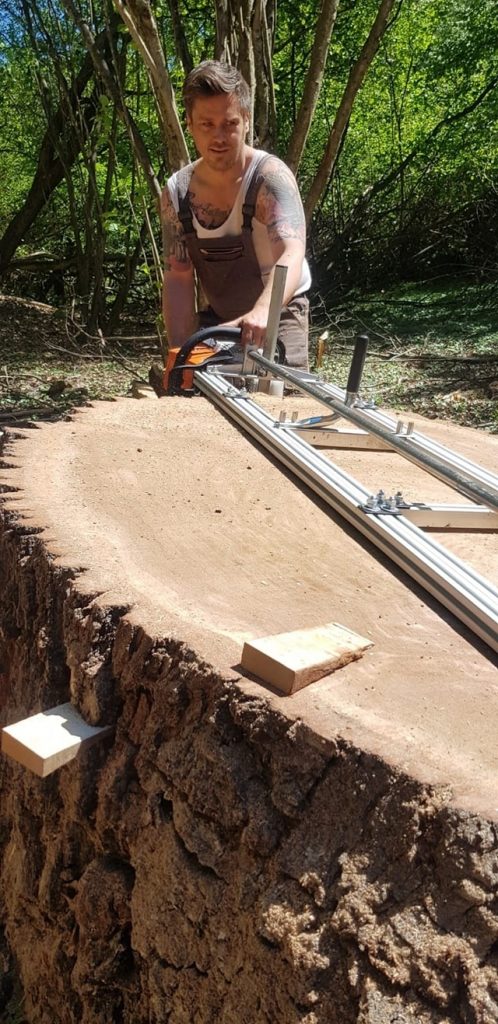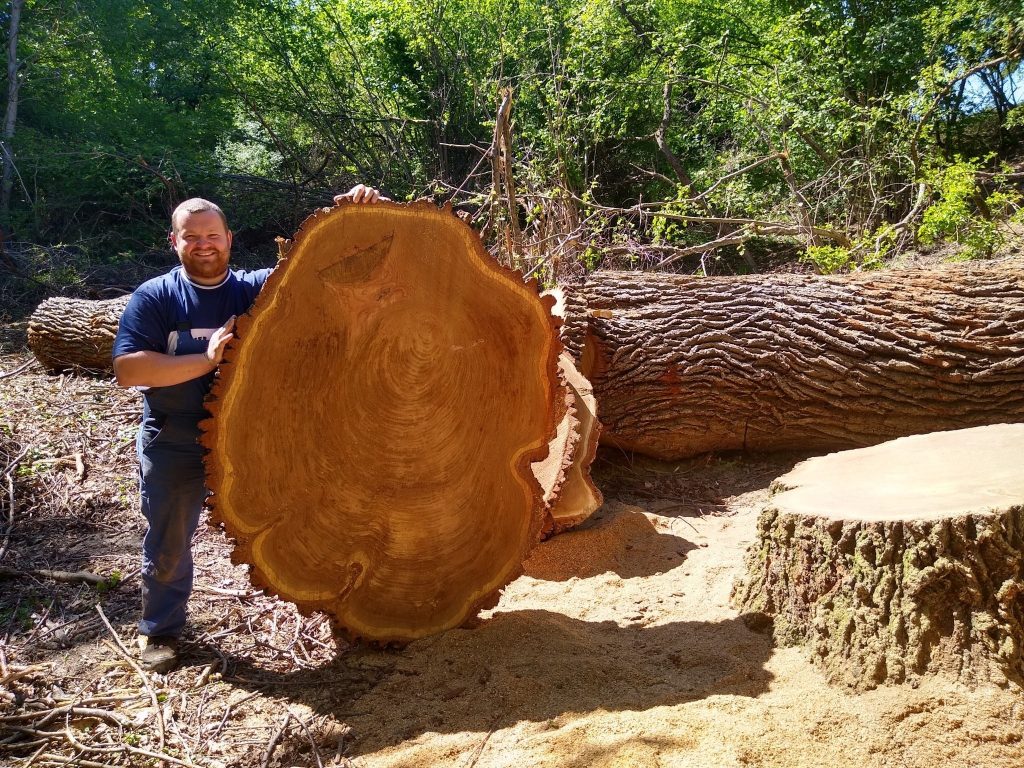 Mit einem Durchmesser bis 190 cm ergab das echt stattliche Scheiben für Tische. Da der Pilz nur den untersten Teil des Stammes zersetzt hatte… blieb sehr viel Holz zur Verarbeitung.