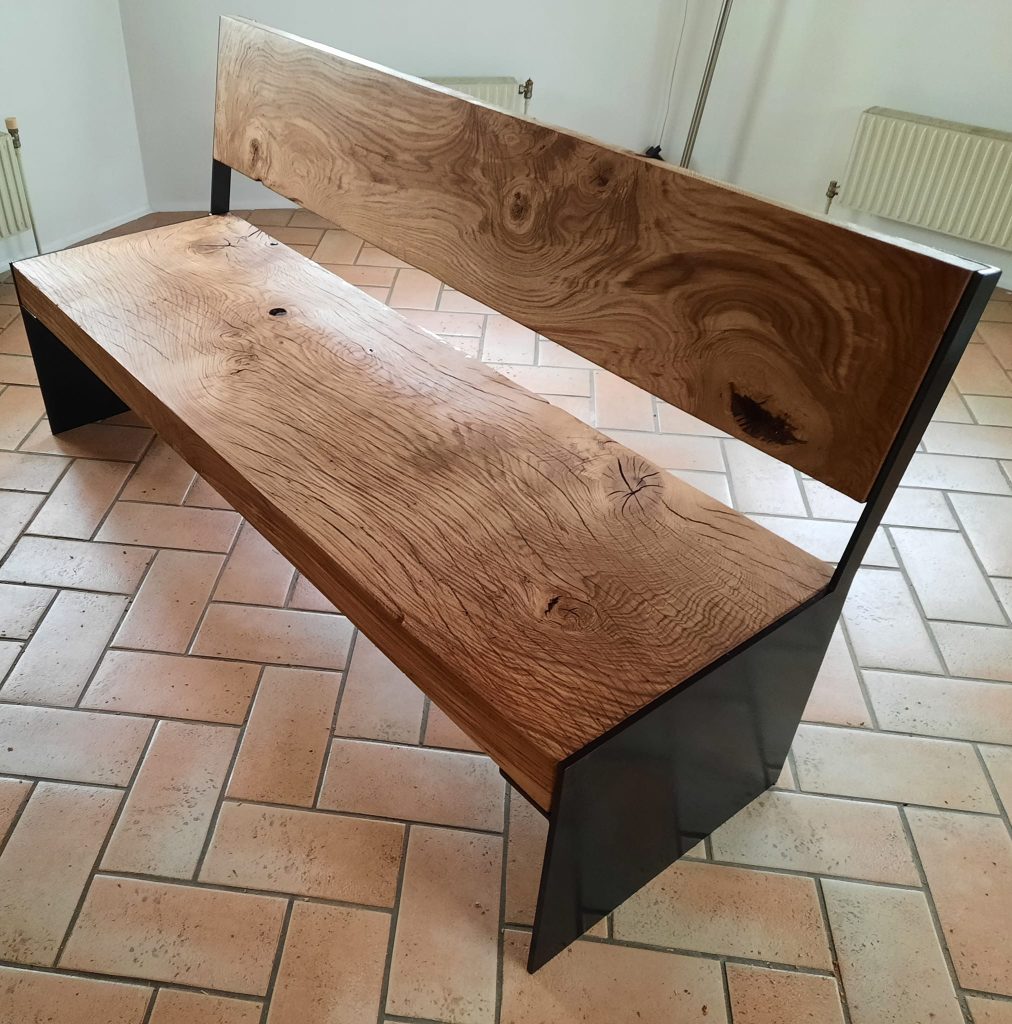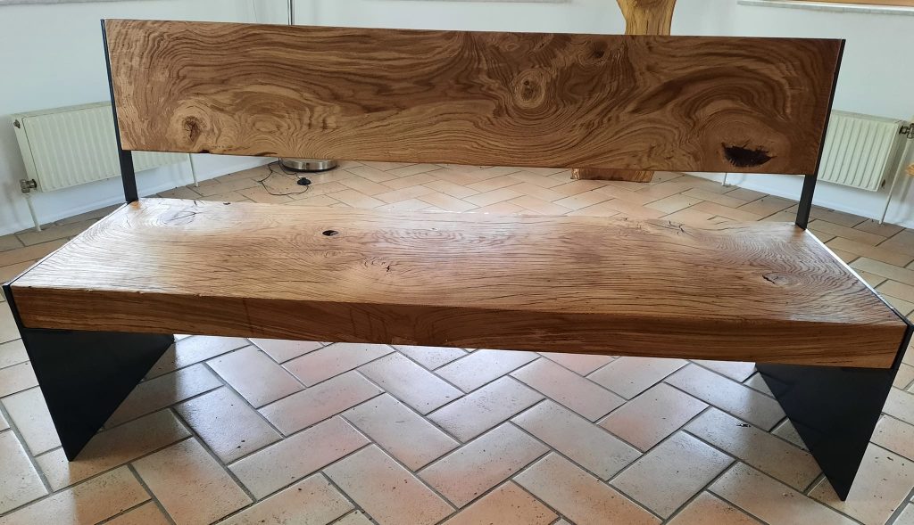 Ein wirklich massives Stück Eiche in Verbindung mit Stahlfüßen wurde hier zu einer wunderschönen Bank verarbeitet. Das Holz von diesem schönen Stück stammt von einem um die 400 Jahre alten Baum. Leider musste diese geschnitten werden, da die Eiche am Stamm immer mehr kaputt und somit instabil wurde.