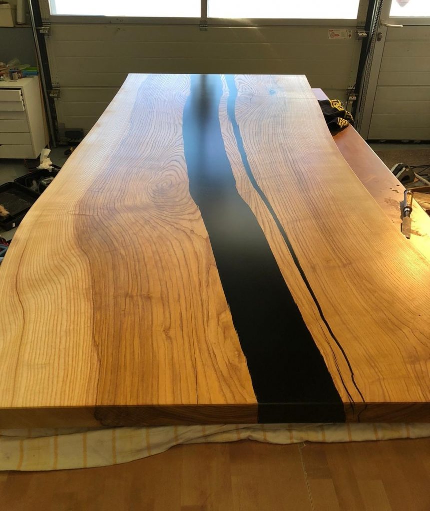 Esche Einbaum PlatteMärz 27, 2025 Holzart: Esche Bearbeitung: Einbaum Schnitt, Epoxid Harz Projektbeschreibung Wieder ein Unikat ausgeliefert – grosszügige Tischplatte, Masse 220 x 105 x 5,5 cm; „Ob 100 Percent Wood unseren Wünschen gerecht wurde? Keine Frage! Ich danke dir Christoph, unser Tisch wurde wunderschön!“