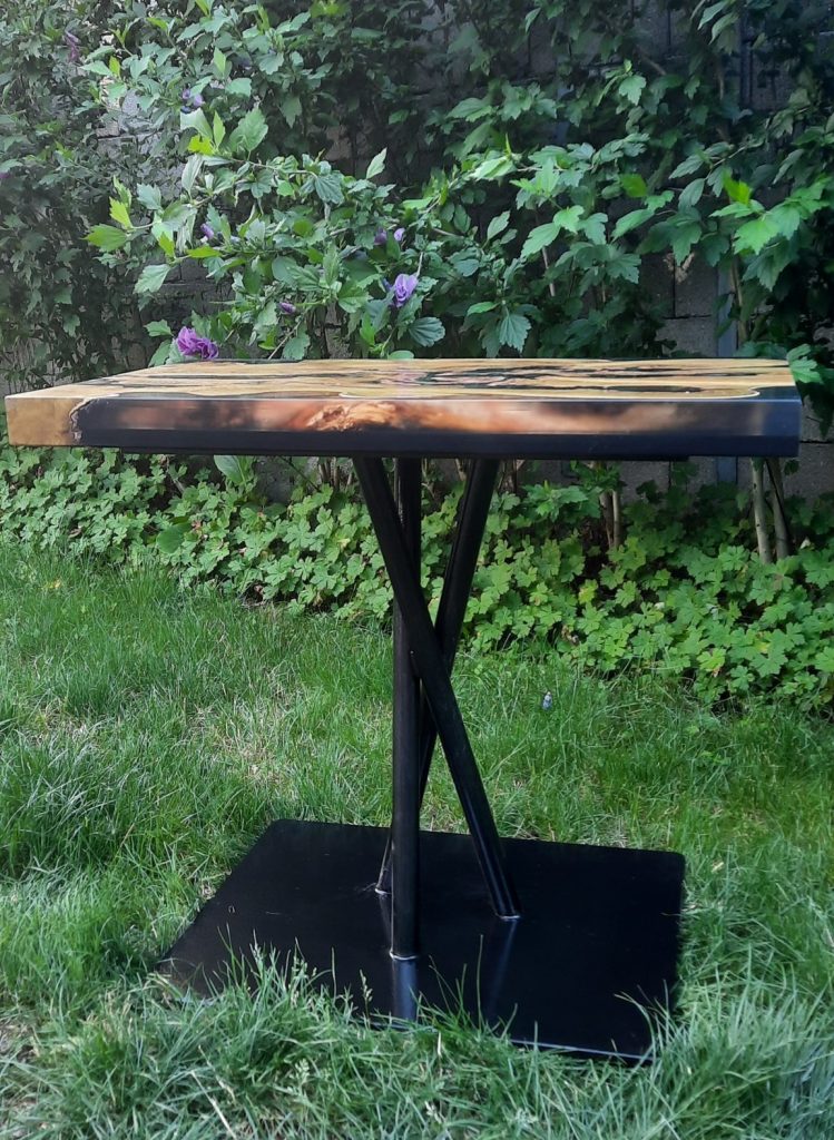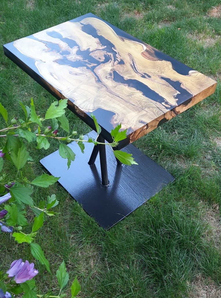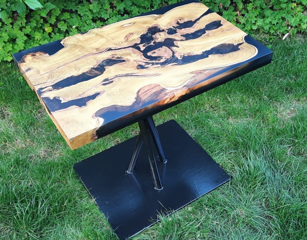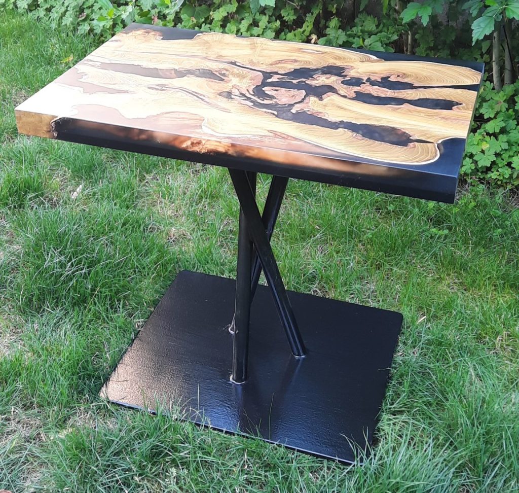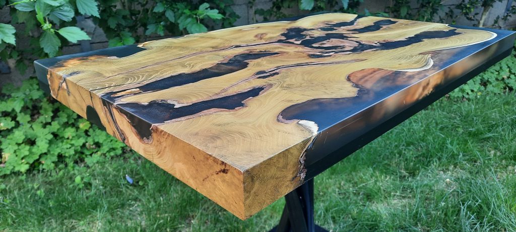 Ein Robinien Unikat auf Stahl. Harz in deepblack, das Untergestell in Hammerschlag Optik, alles matt – ein sehr stimmiges Gesamtbild, massiv und edel gut im Einklang. Wir sind hier bei einem Gewicht von gesamt circa 60 kg – was man aber durch das zarte Design des Untergestells nicht vermuten würde.