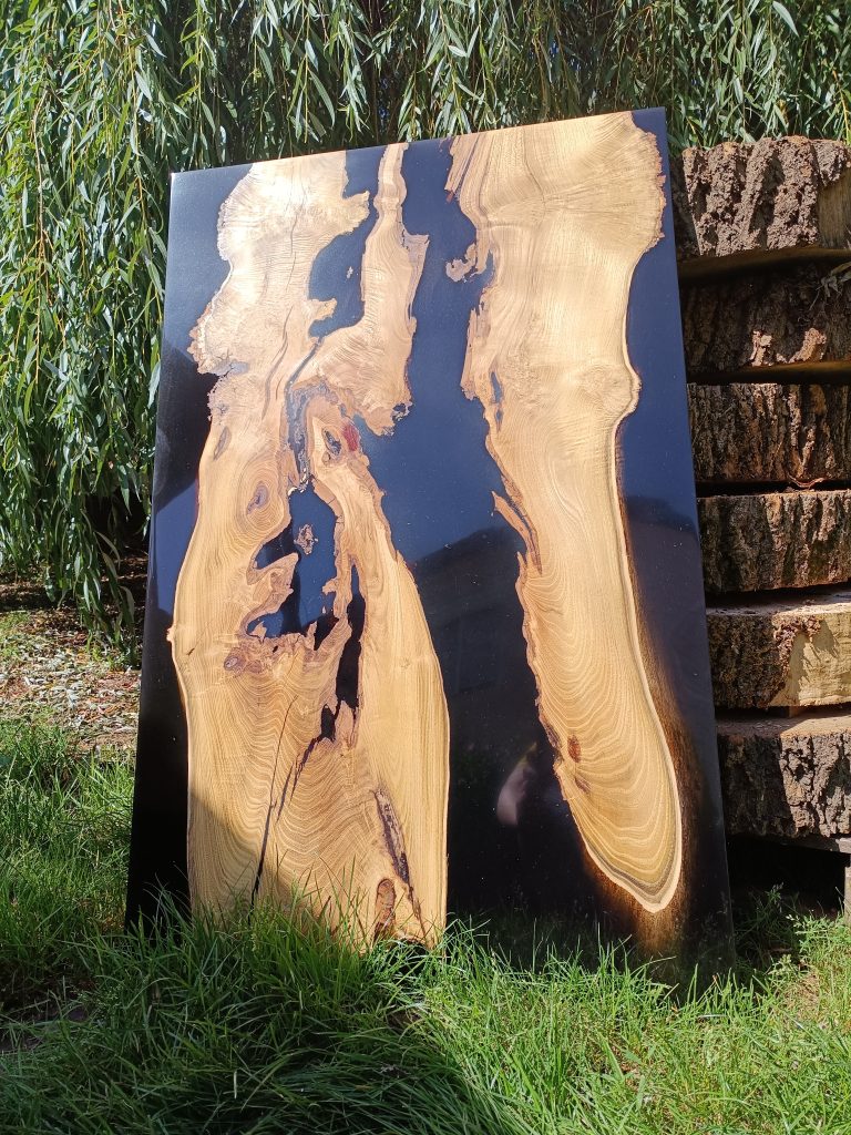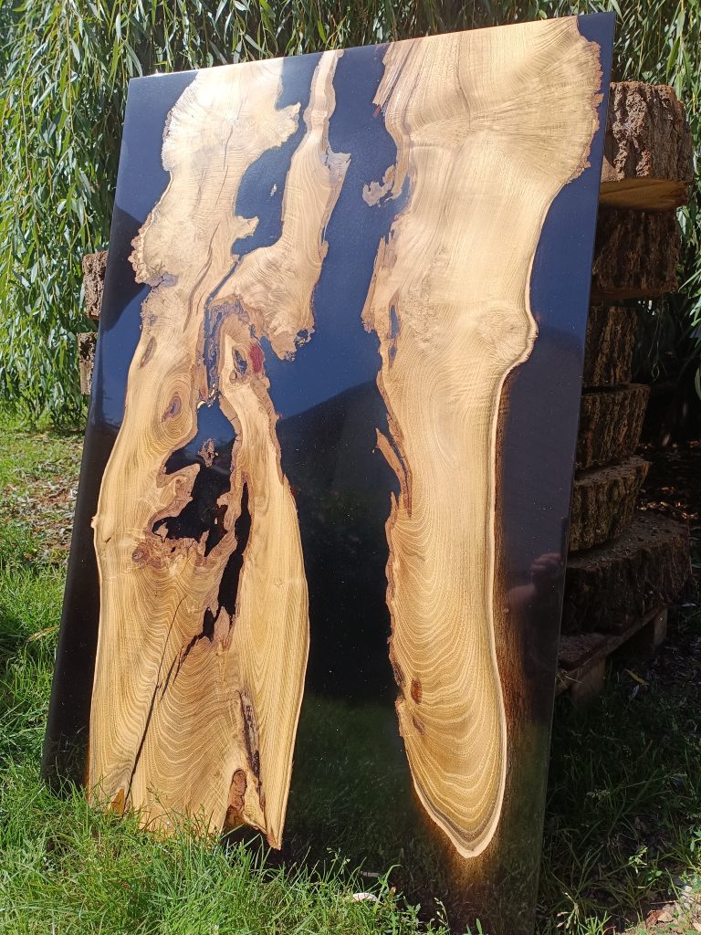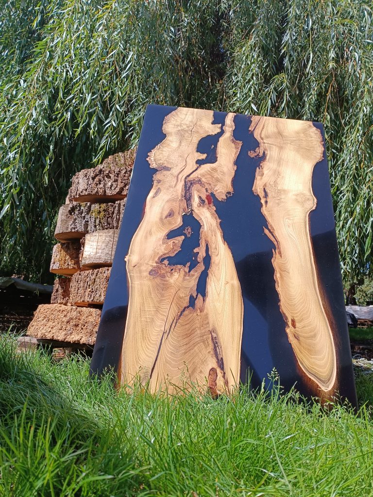 Diese wunderschönen Robinienstücke mit Maserknollen wurden auf Kundenwunsch in schwarzem Harz kombiniert. Beide Stücke stamme aus dem selben Stamm und waren vor der Verarbeitung ein ganzes Stück. Sie wurden neu positioniert und vergossen. Das Harz ist halbtransparent in Hochglanz… daher die Spiegelungen im Harzbereich am Foto