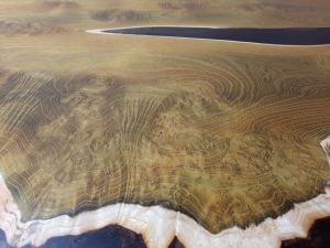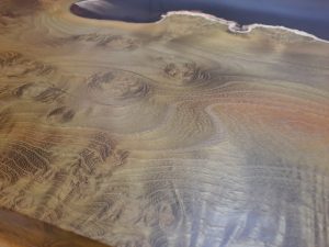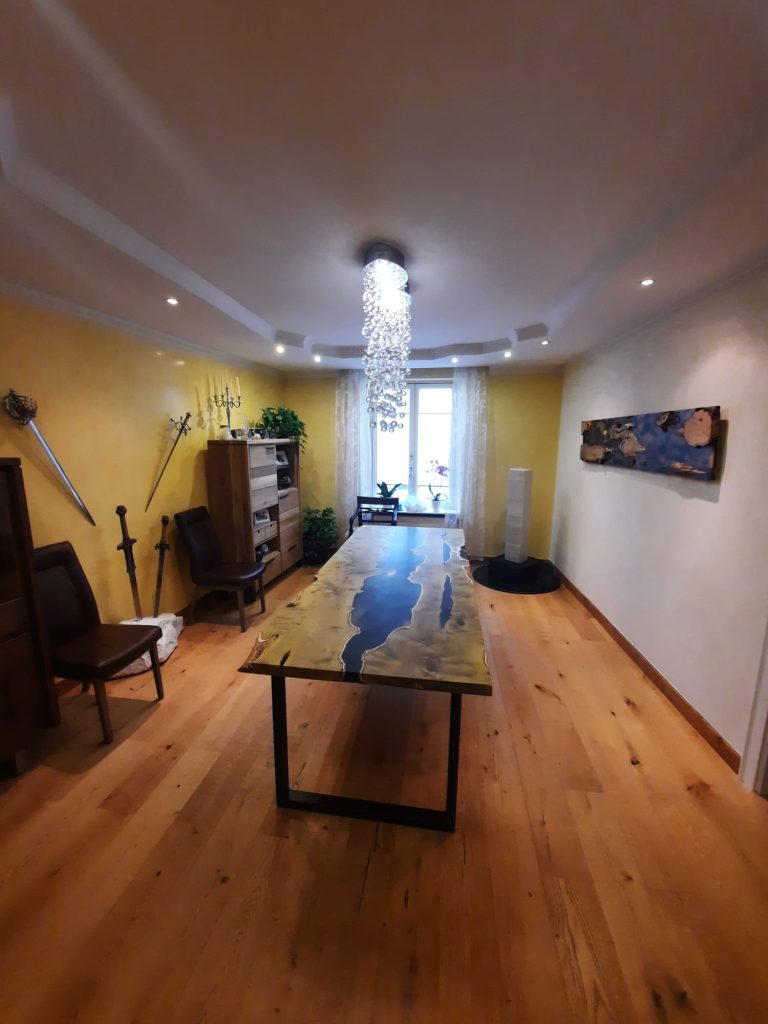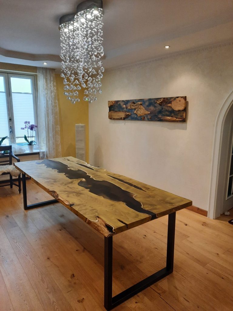 Ergänzend schmückt aus selbiger Holzart ein Wandbild mit 200×40 cm die Wand hinter dem Tisch. Hier ist der aus Harz gegossene Bereich teilweise deutlich niedriger als das Holz und dadurch gibt es einen einzigartigen 3D Effekt.