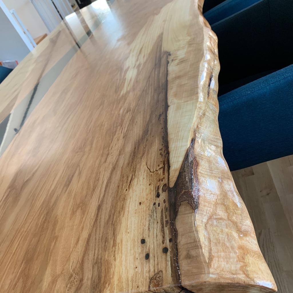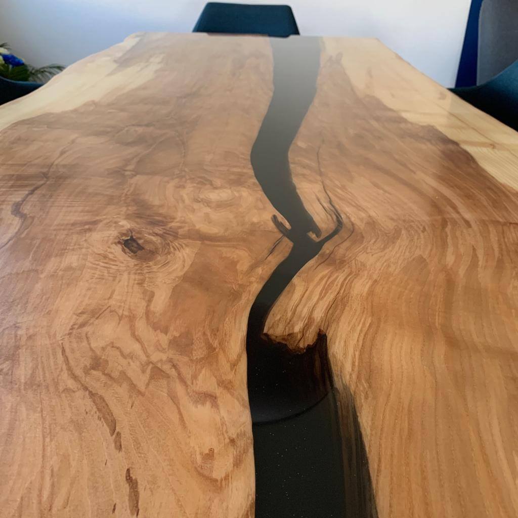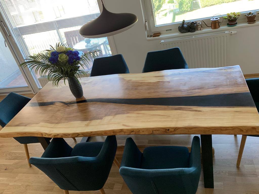 Tischplatte EscheMärz 27, 2025 Holzart: Esche Bearbeitung: Holzschnitt, Epoxid Harz Projektbeschreibung Einbaum Tischplatte aus Esche, Masse 220 x 100 x 5 cm; Epoxid Harz Inlay;