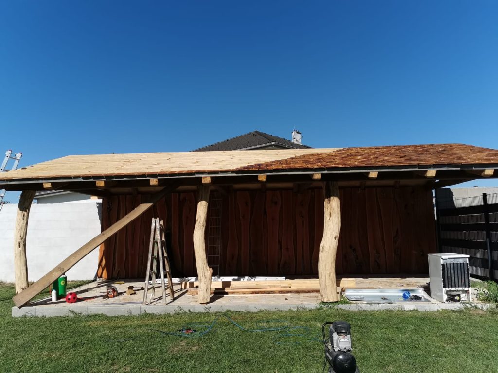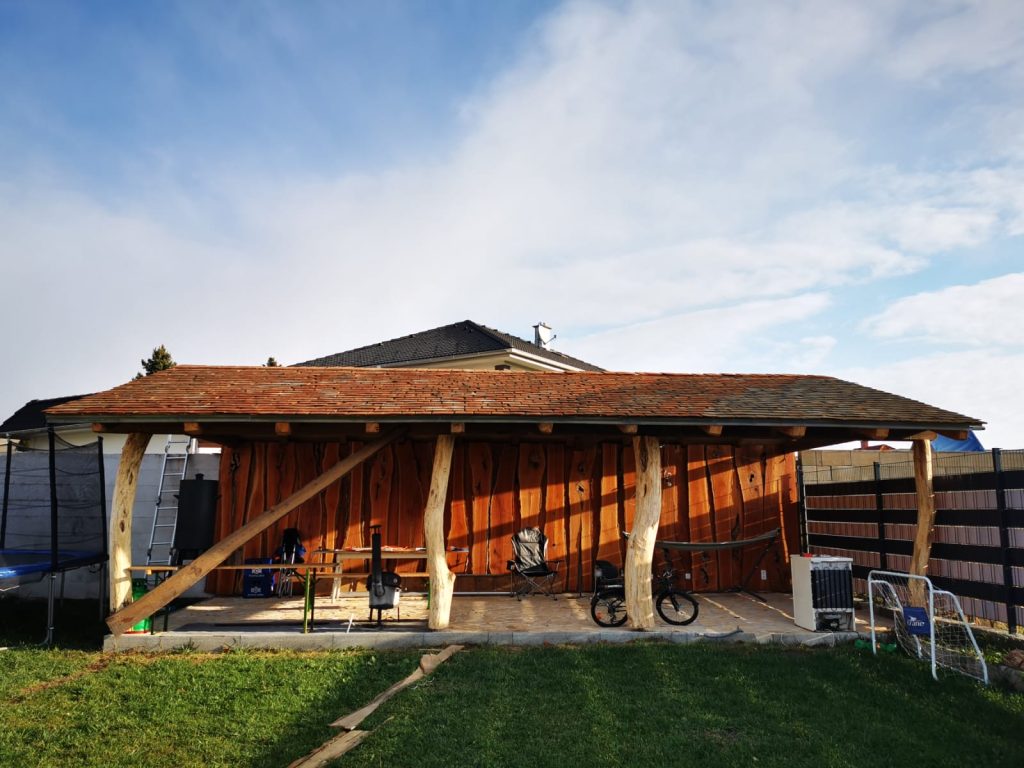 Gemeinsam mit dem Kunden haben wir uns für das Holz der Robinie (Scheinakazie) entschieden, da dieses sehr hart und witterungsbeständig ist. Die Wand wurden aus einer doppelt und versetzt verlegten Verkleidung mit 4 cm dicken Robinienplatten verkleidet. Auf dieser und auf 4 Baumstämmen steht das Dacht, welches mit Robinien Schindeln gedeckt wurde.