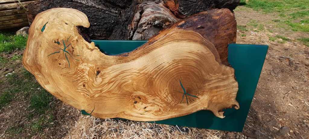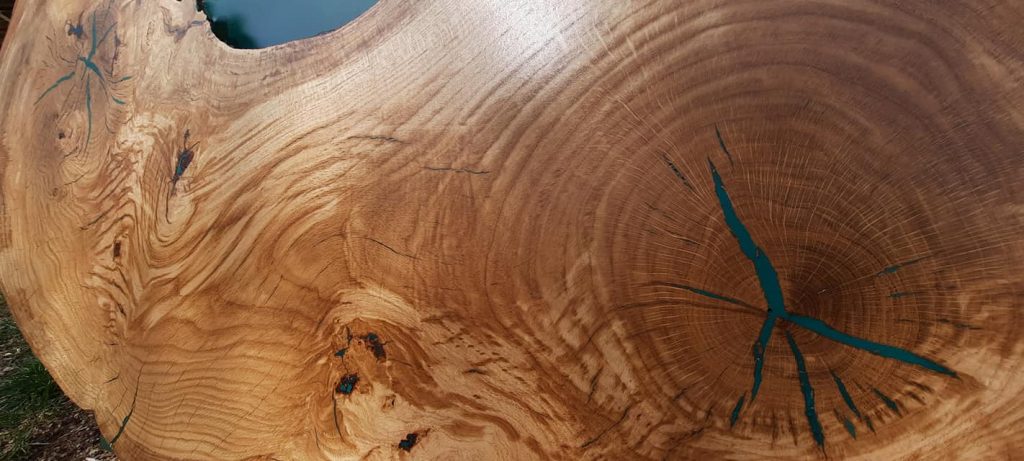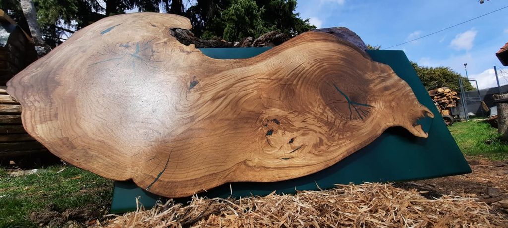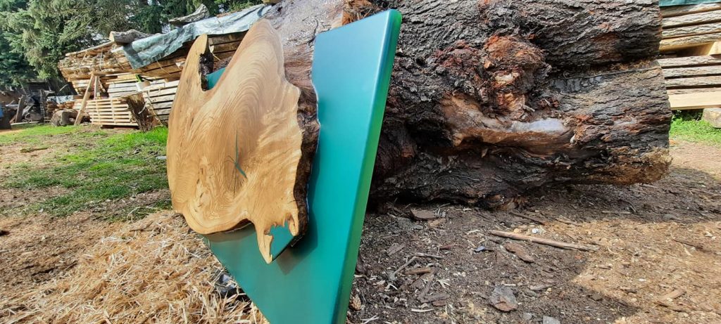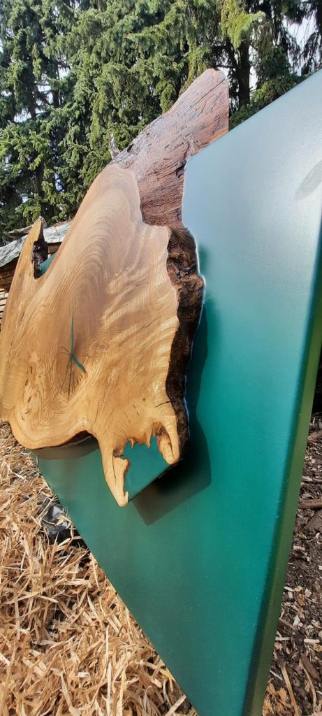 Ein besonderer Auftrag war das Wandbild „breakin the border“ mitten im Lockdown. Das Bild wurde aus einer einem speziellen Stück Eiche im Längsschnitt gewonnen hergestellt. Untypisch und wirklich zum Unikat wird es, da es trotz des Längsschnittes eine Scheibenform aufweist. Die Veredelung mit Harz erfolgte in einem tiefen Grün.